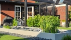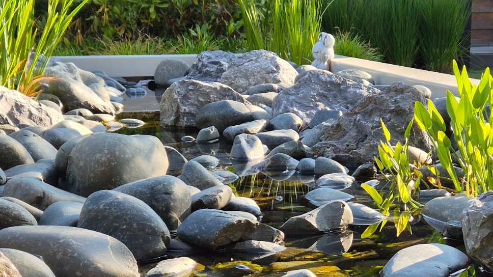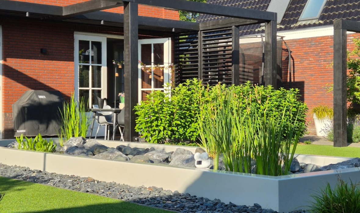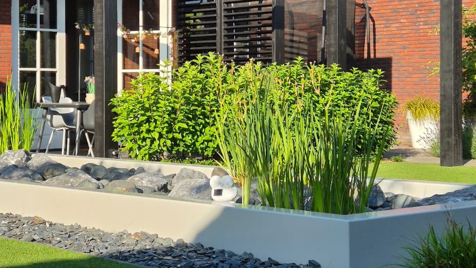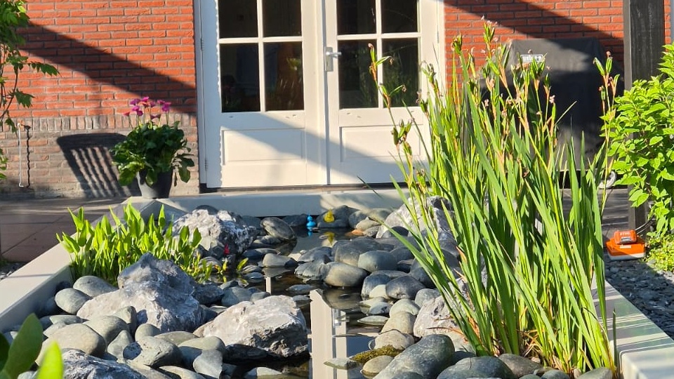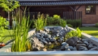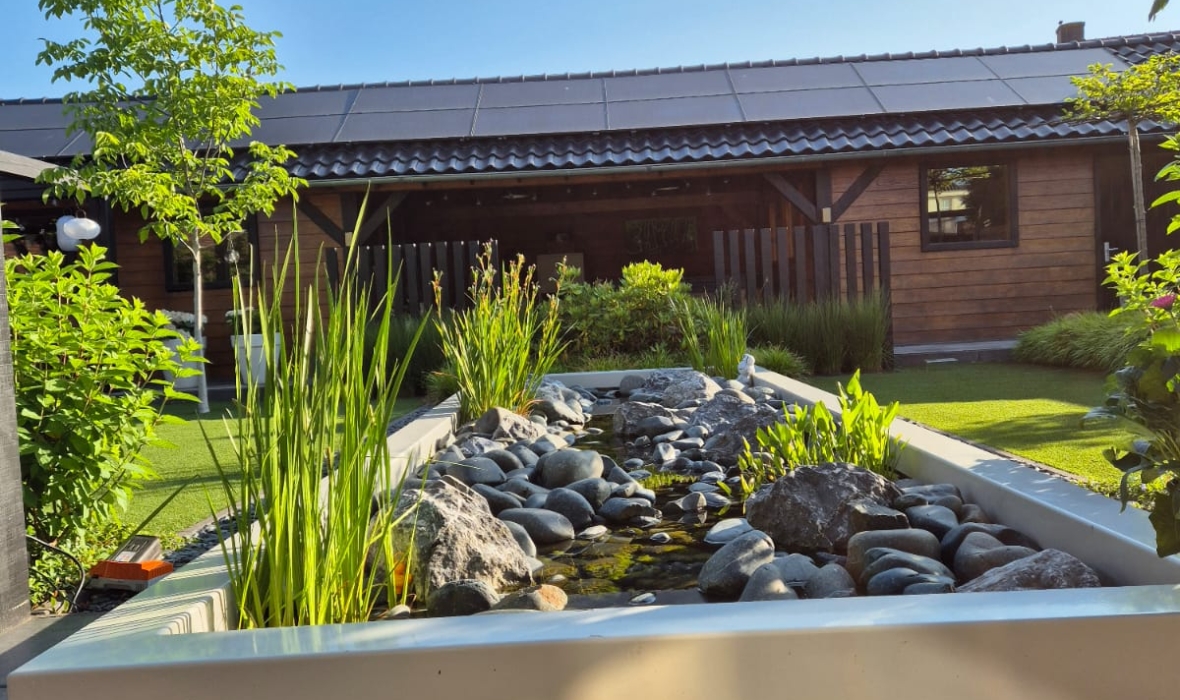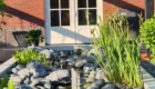 Strakke tuin met rotsachtige waterpartij en houtbouw elementen.