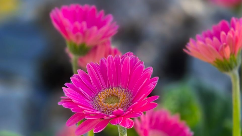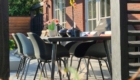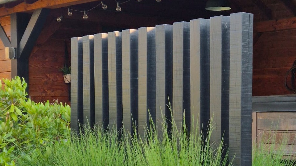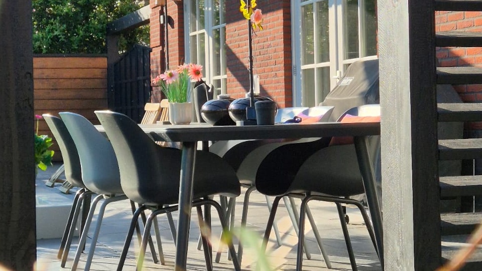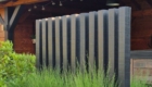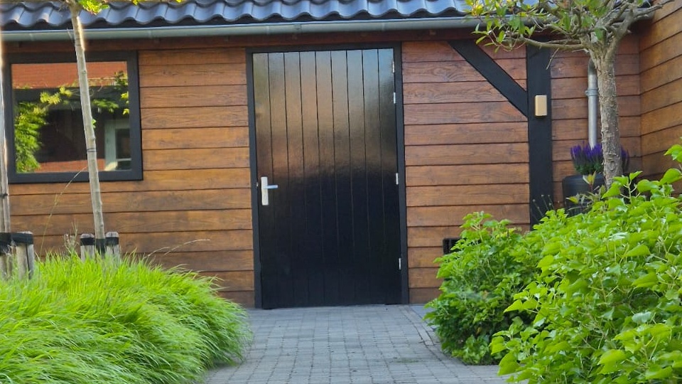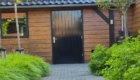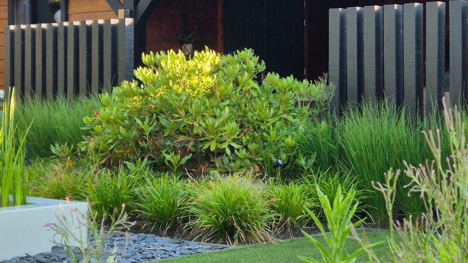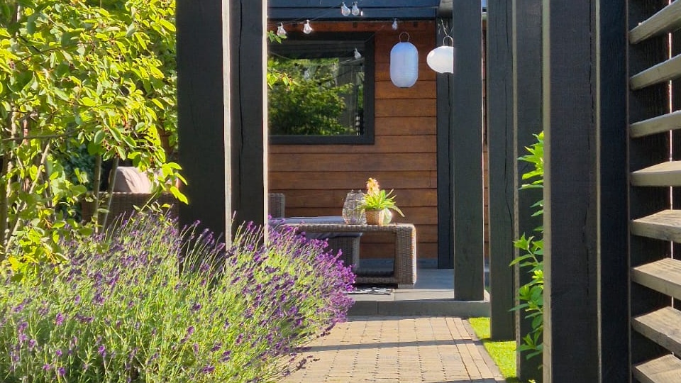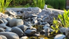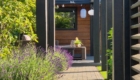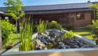 Strakke tuin met rotsachtige waterpartij en houtbouw elementen.